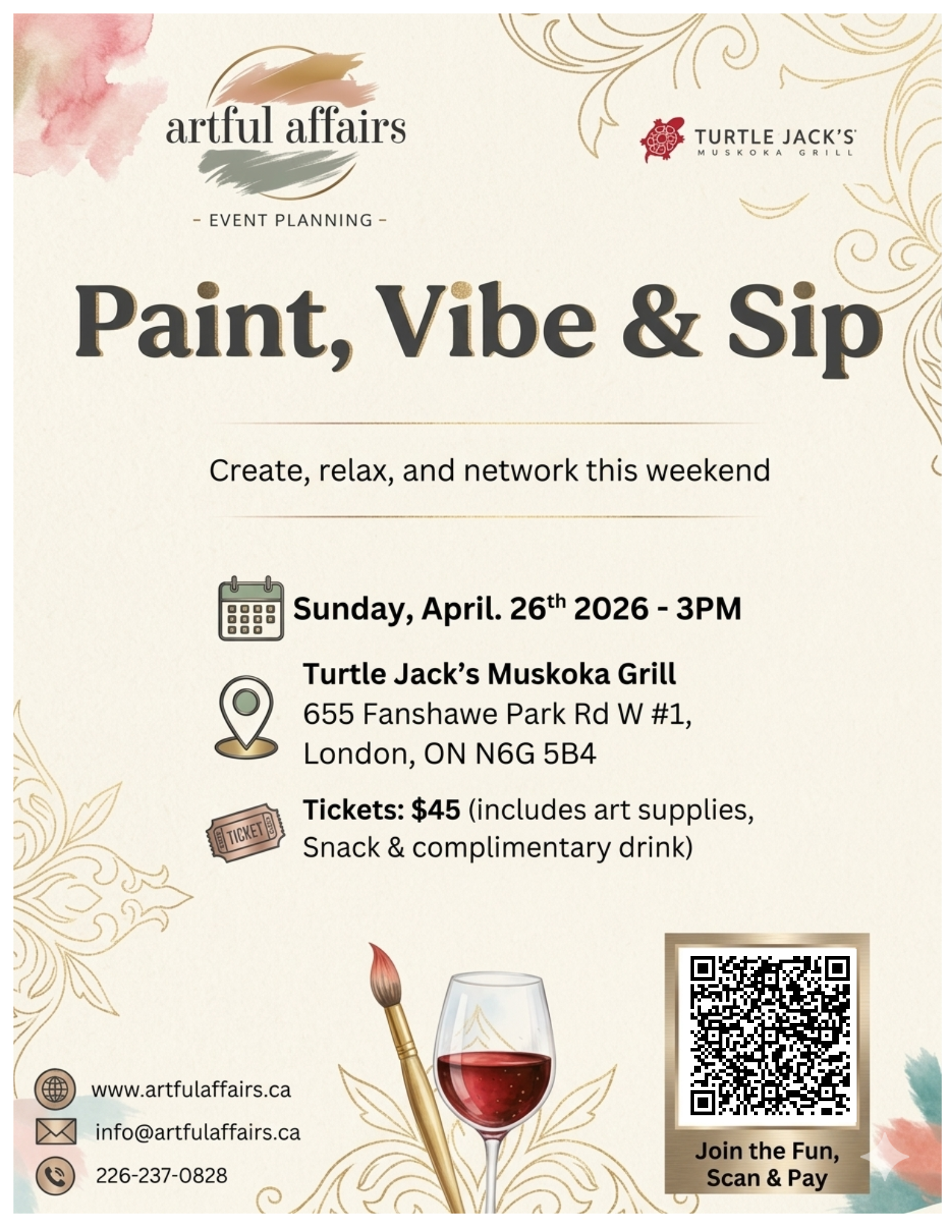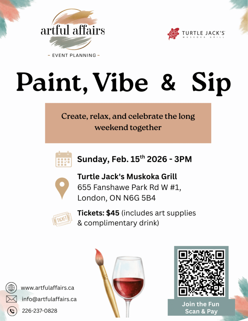 At Artful Affairs, we specialize in creating unforgettable, artistic experiences for any occasion. Whether you’re planning a paint and sip event, a romantic surprise engagement, or a unique corporate team- building session, we’re here to turn your vision into a reality. We collaborate with local restaurants and stunning venues around London, Ontario. We are bringing creativity and elegance to every celebration.